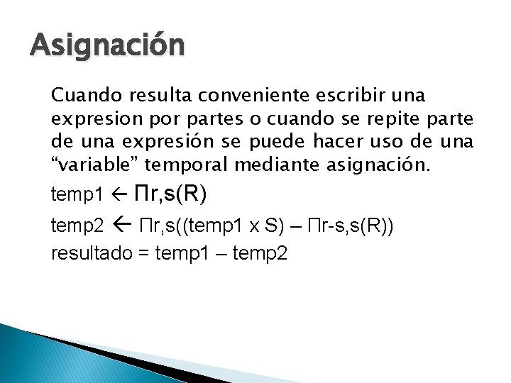 Para poder realizar esta operación R y S deben ser compatibles para la unión. Algebra Relacional - División La división en función de operadores base. Las operaciones fundamentales del álgebra relacional son selección proyección unión diferencia de conjuntos.