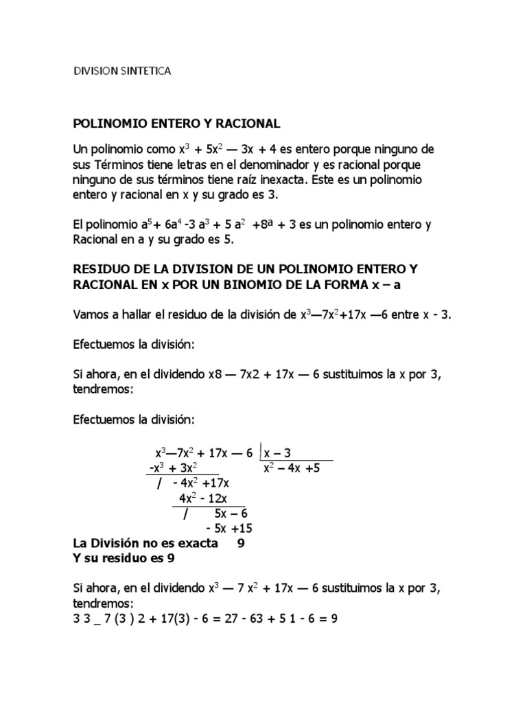 La división sintética es una operación para simplificar la obtención del cociente y el residuo lo que nos ayudará a encontrar los valores de X para la división de dichos polinomios. POLINOMIO ENTERO Y RACIONAL. Compartimos con ustedes el libro algebra baldor de aurelio baldor en formato pdf para descargar.